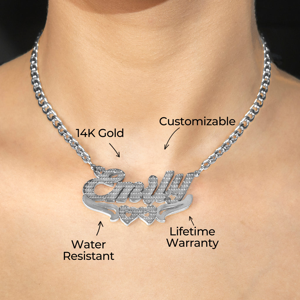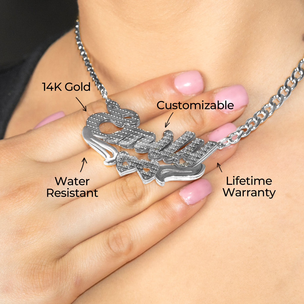 Our 14K White Gold Plated Ladies Script Name Plate Necklace brings bold personalization and elevated shine together in one standout piece. Designed to highlight your individuality, this necklace adds a confident, luxurious touch to any look. Each piece is handcrafted to order, making your name a truly unique focal point.