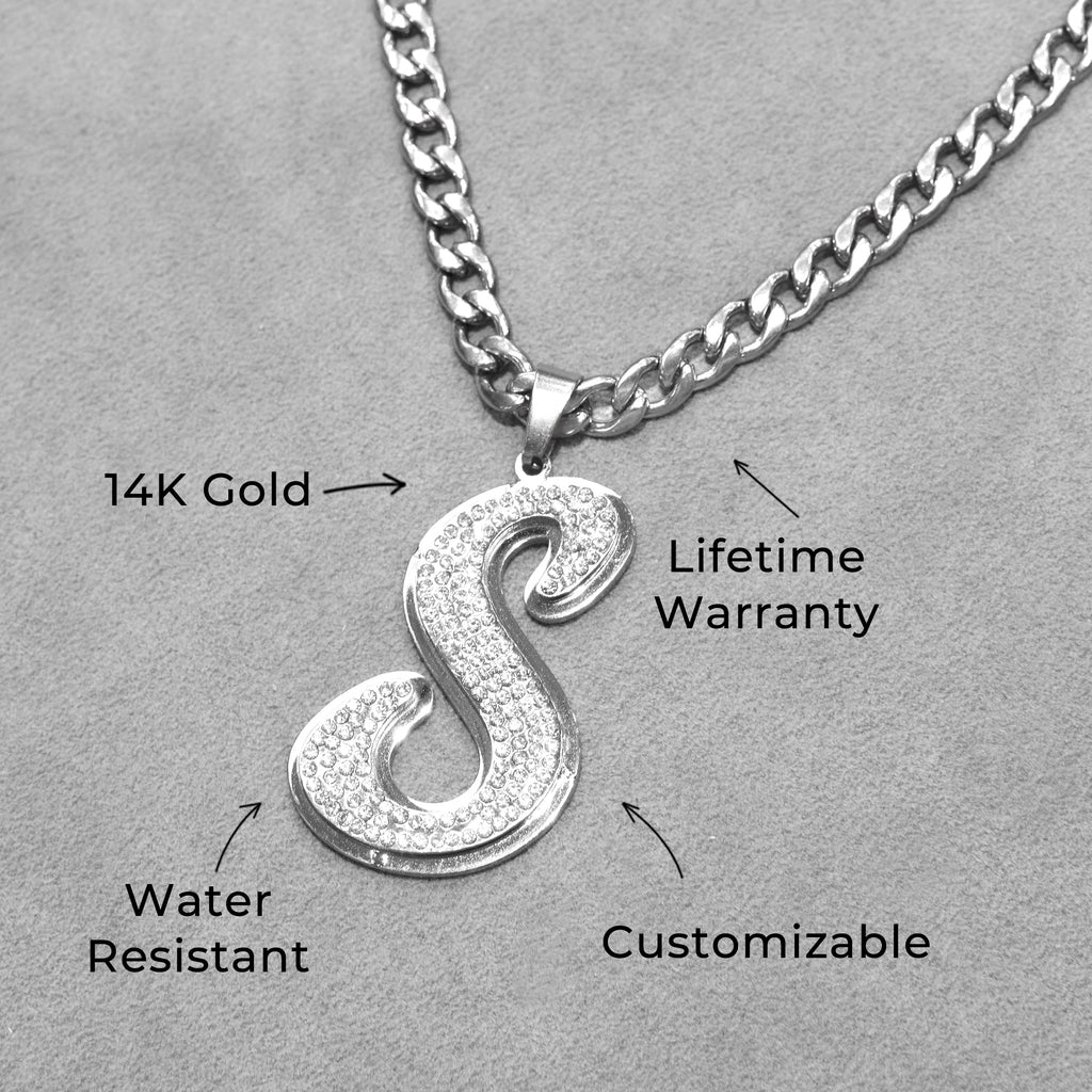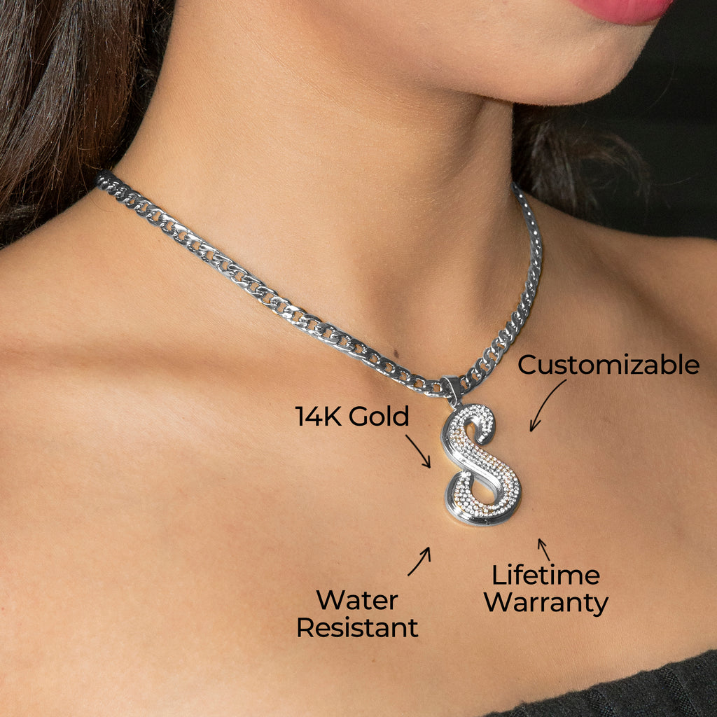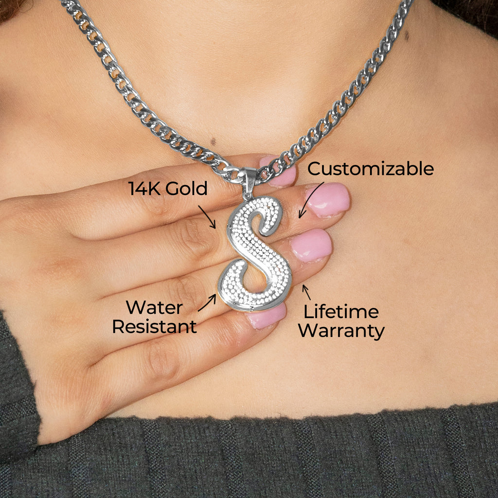 Customization: Your name is individually handcrafted in flowing script lettering and iced with high-quality VVS simulant stones, creating a personalized piece with luxurious brilliance and modern appeal.