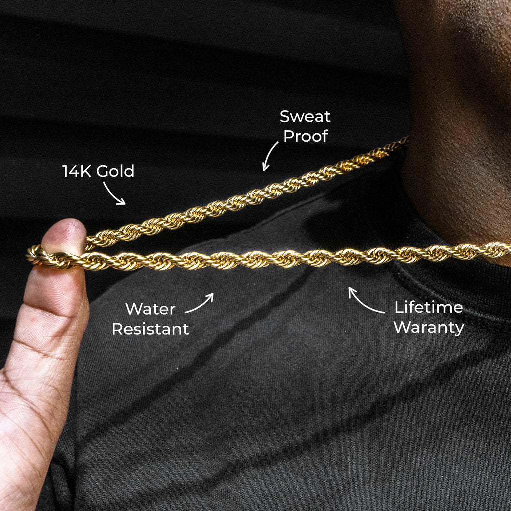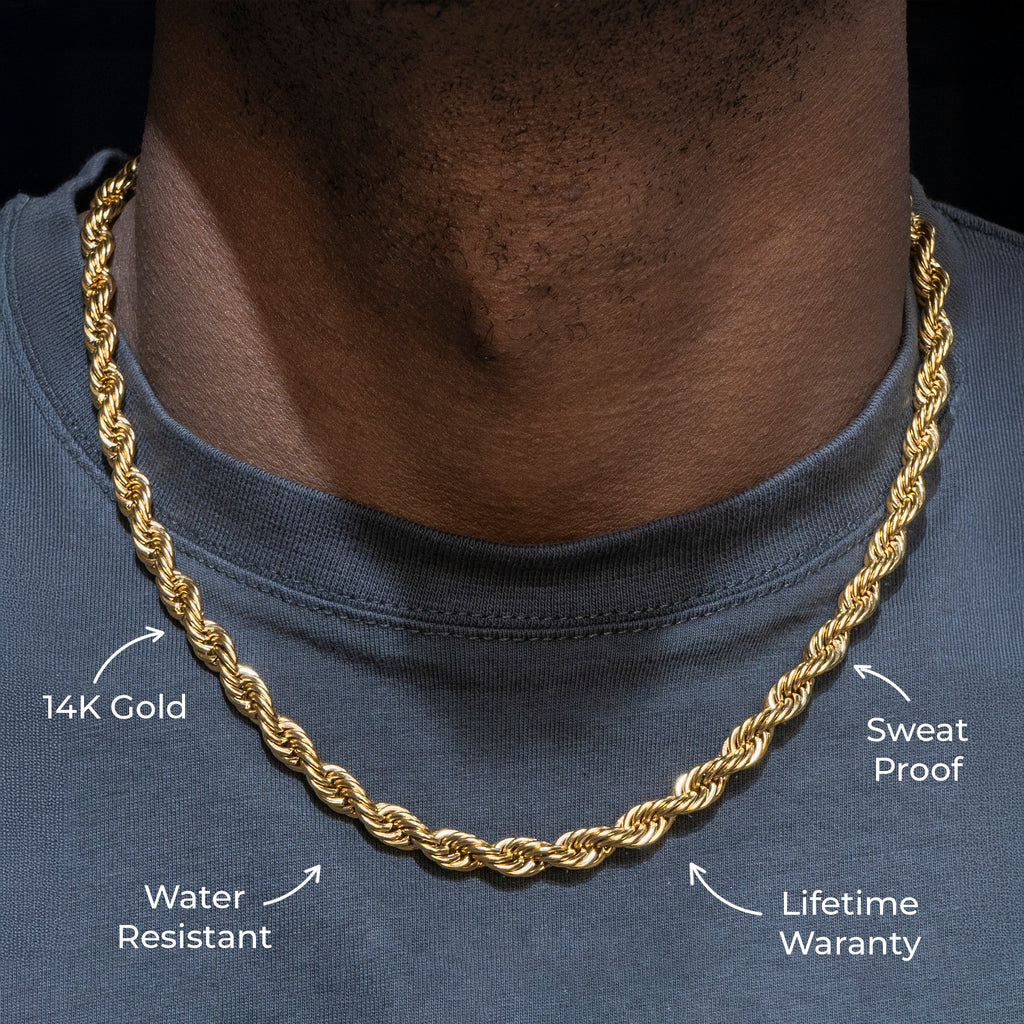 The GoldUrban 14K Yellow Gold Plated Men’s Solid Rope Chain is water-resistant, sweat-proof, and plated in real 14K yellow gold, giving you the premium look of solid gold with the durability to wear every day — from workouts to nights out.