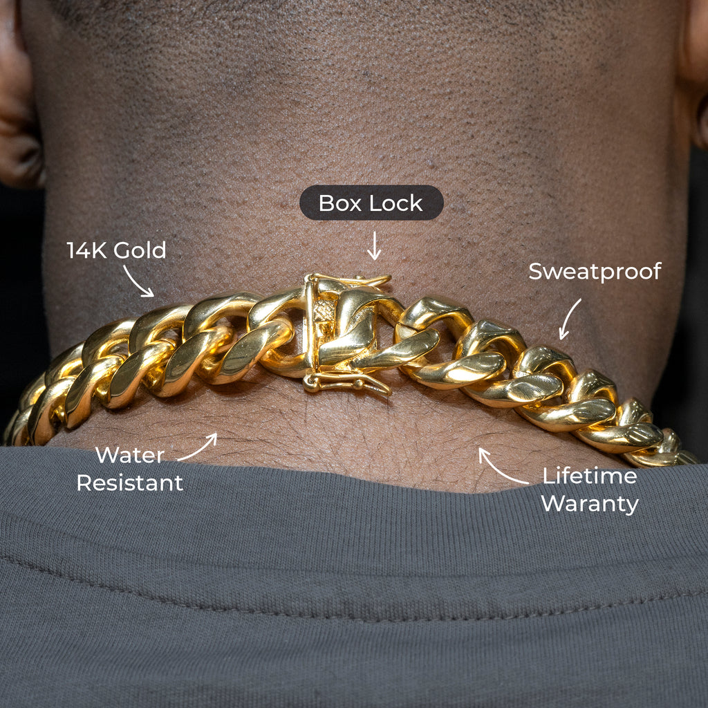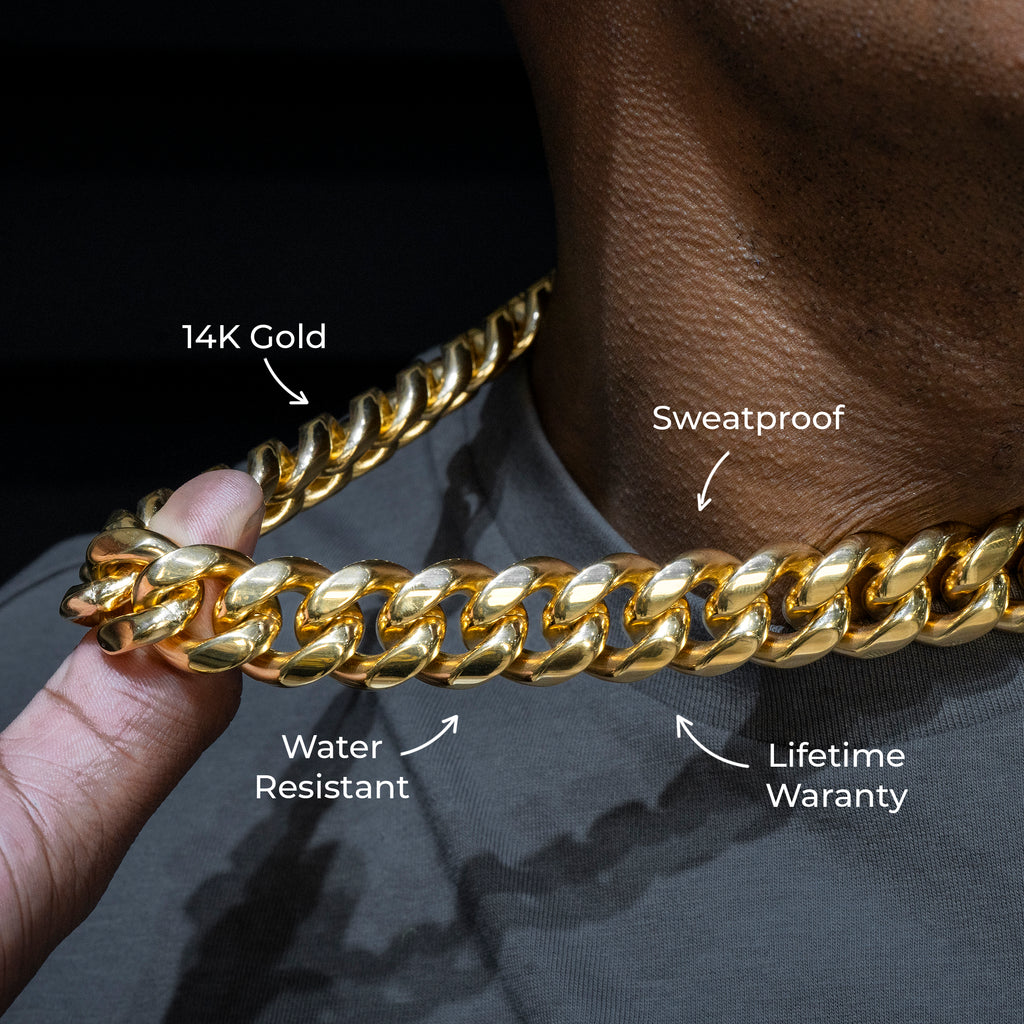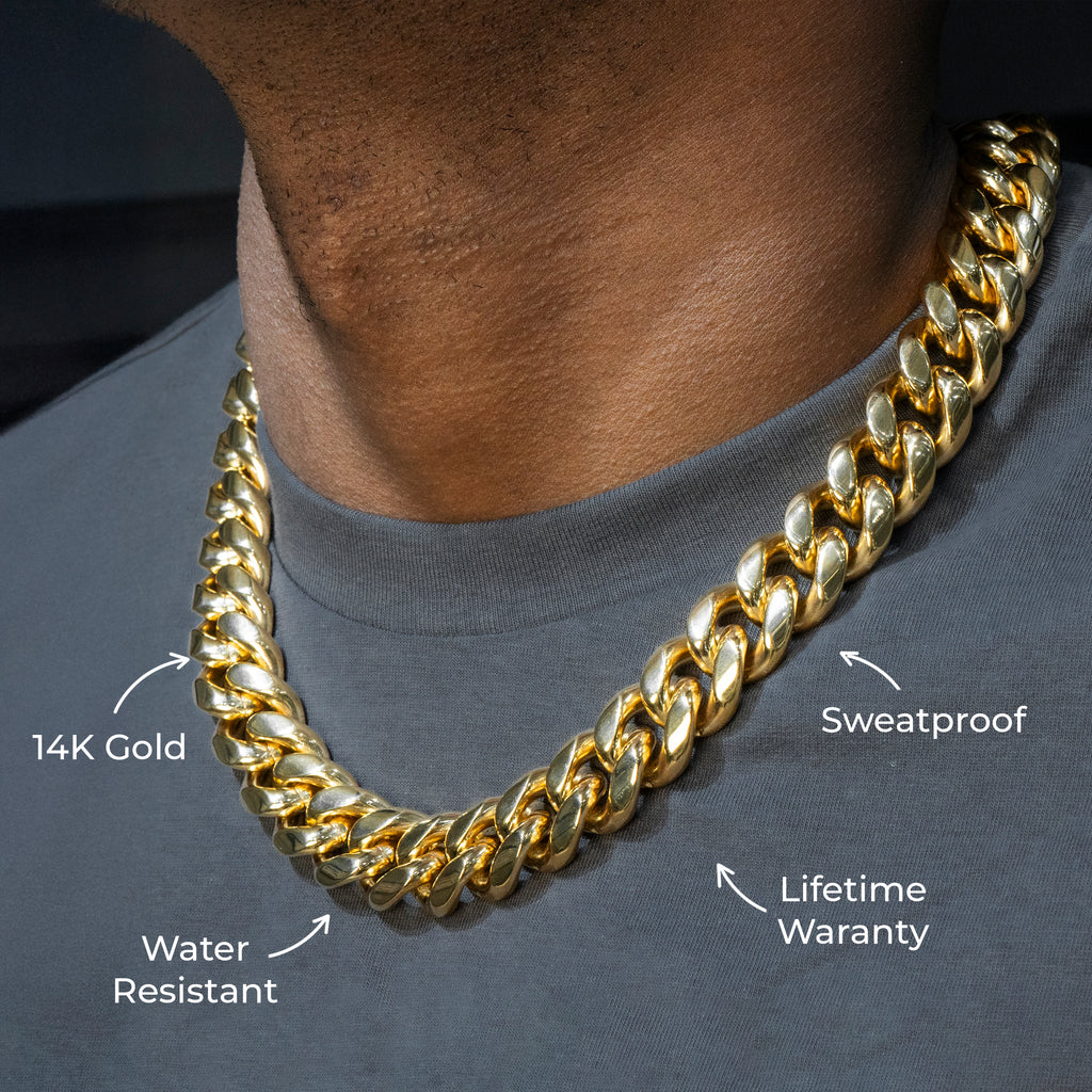 The GoldUrban 14K Yellow Gold Plated Men’s Miami Cuban Link Chain is water-resistant, sweat-proof, and plated in real 14K yellow gold, giving you the luxurious look of gold with the durability for everyday wear — from workouts to nights out.