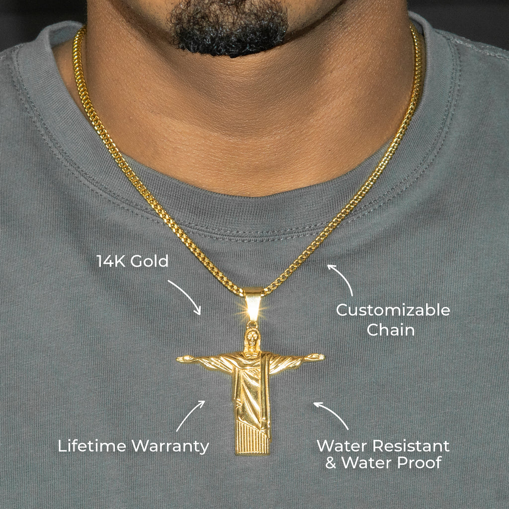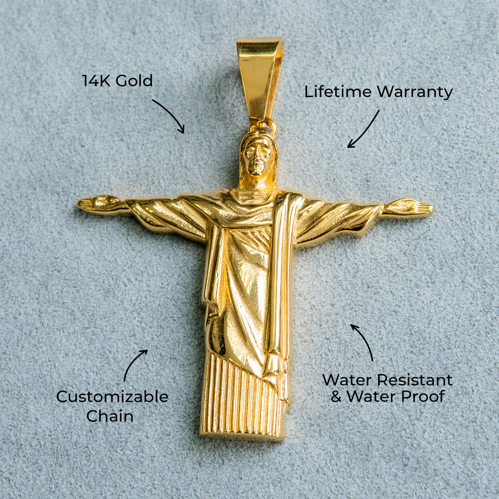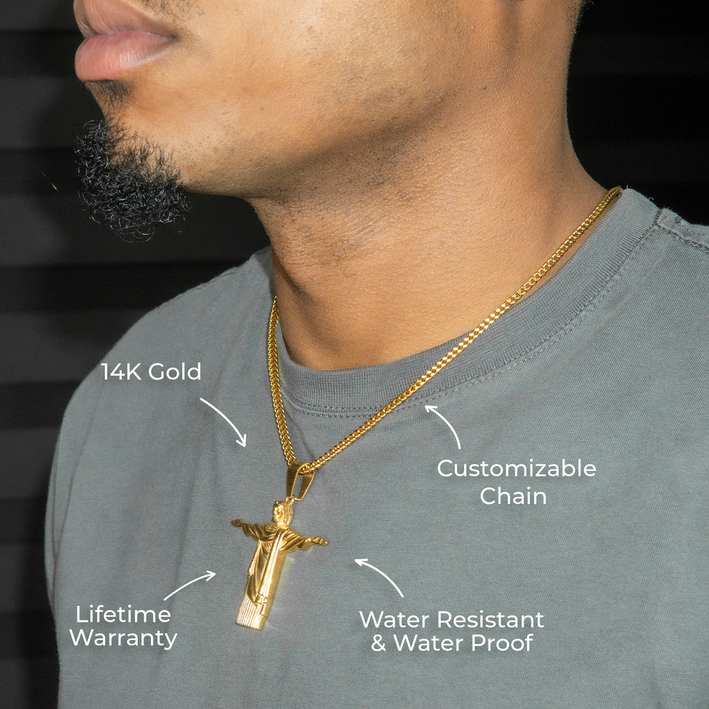 The GoldUrban 14K Gold Plated Jesus Pendant is water-resistant, sweat-proof, and plated in real 14K gold, combining lasting durability with a striking, faith-inspired design. Weighing 15 grams, this pendant provides a premium, high-end feel while making a meaningful statement of devotion and style.