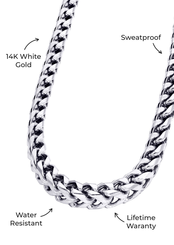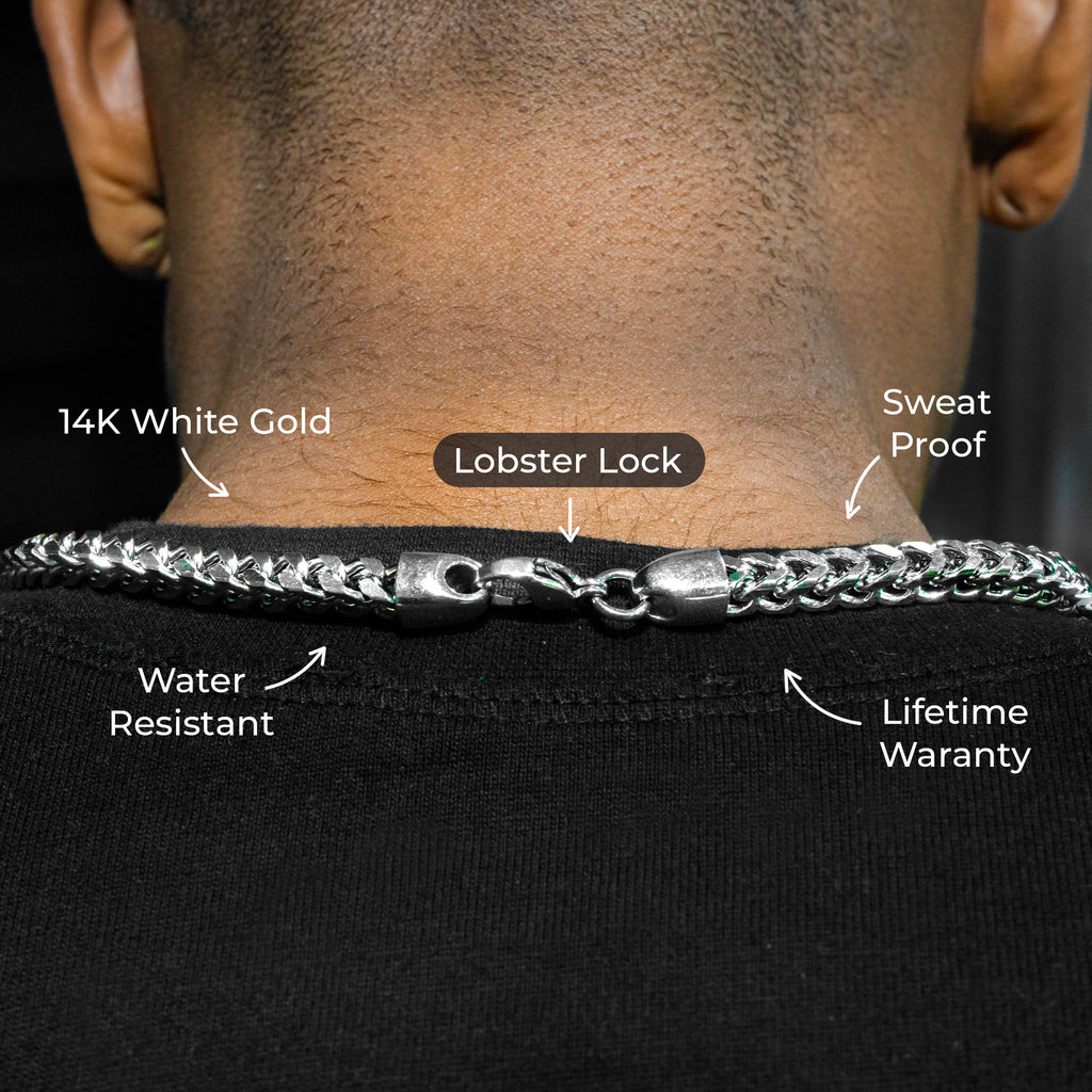 The GoldUrban 14K White Gold Plated Men’s Franco Chain is water-resistant, sweat-proof, and plated in real 14K white gold, giving you the premium look of solid gold with the durability to wear every day — from workouts to nights out.