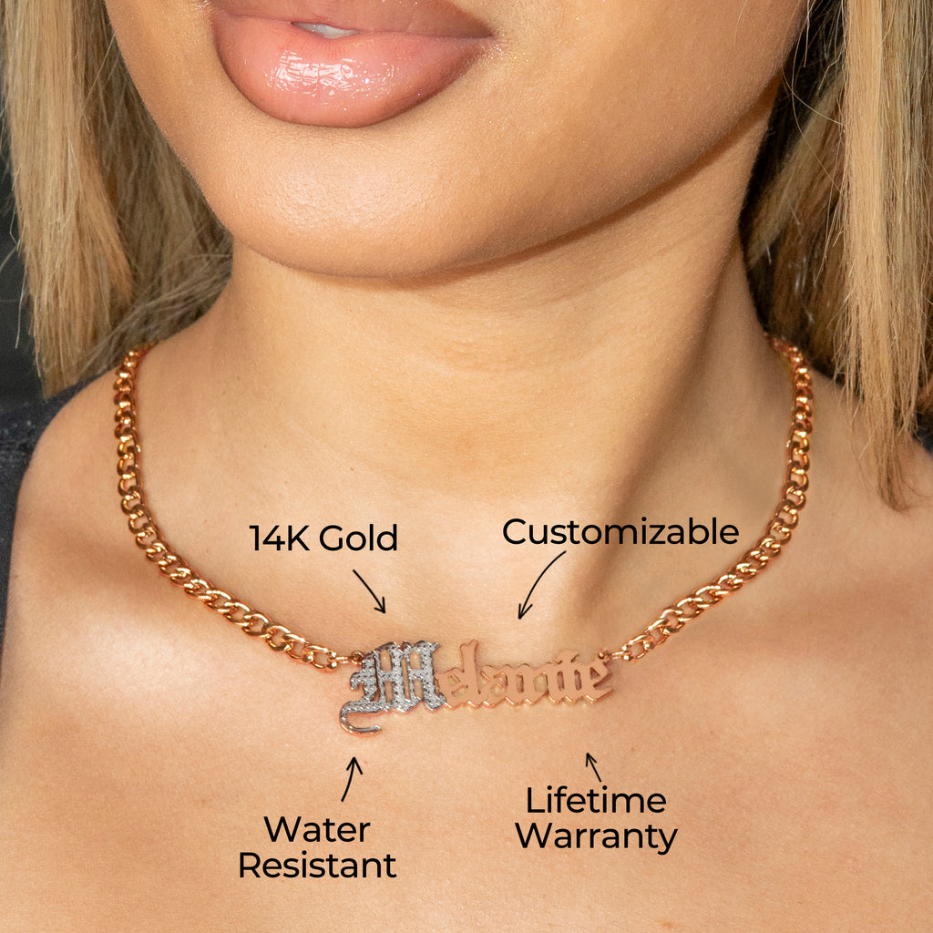 Our 14K Rose Gold Plated Ladies Script Name Plate Necklace blends warm elegance with bold personalization for a beautifully elevated look. Designed to highlight your individuality, this piece brings a radiant rose-gold glow and refined sophistication to any outfit. Each necklace is handcrafted to order, turning your name into a meaningful and polished centerpiece.